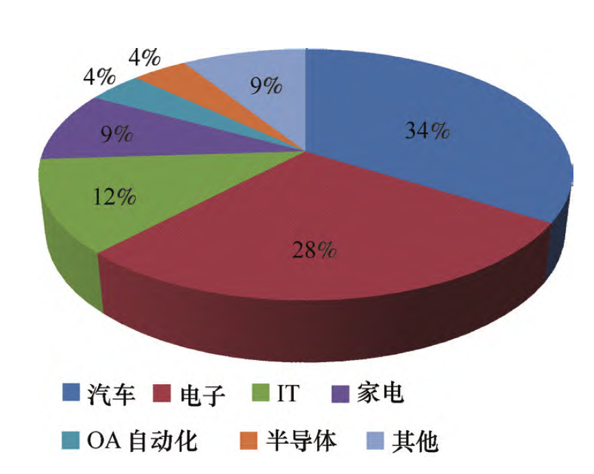 据中国模具工业协会统计数据显示,目前,我国模具产品的主要应用领域集中于汽车、电子、IT及家电等行业。这些行业往往需要精密的工具或零部件,而模具正是为这些行业提供了一种高效、经济的生产方式。在模具应用行业,汽车行业的占比最大,约为34%,电子行业约占28%,IT行业约占12%,家电行业占比9%,OA自动化及半导体分别占比4%,如图1所示。