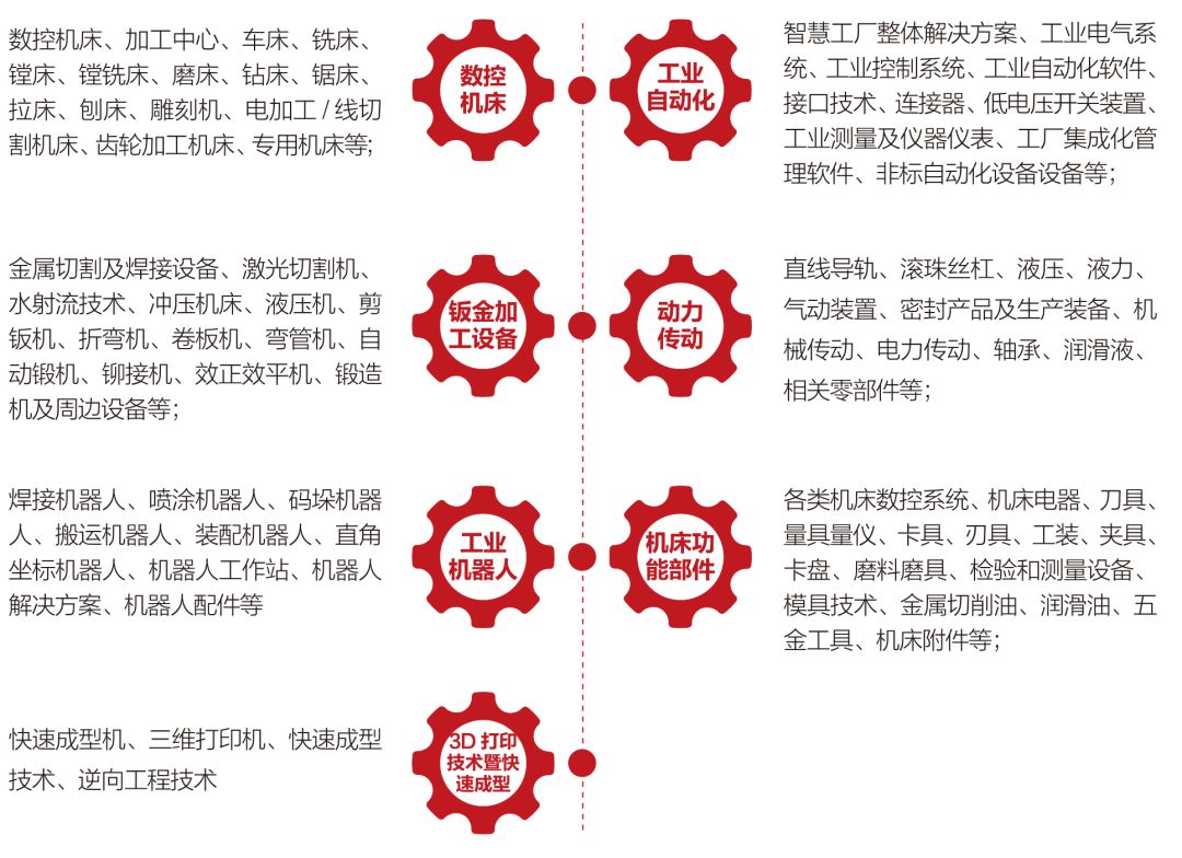 机床功能部件:各类机床数控系统、直线导轨、滚珠丝杠、刀具、量具量仪、卡具、刃具、工装、夹具、卡盘、磨料磨具、检验和测量设备、模具技术、金属切削油、润滑油、五金工具、机床附件等;